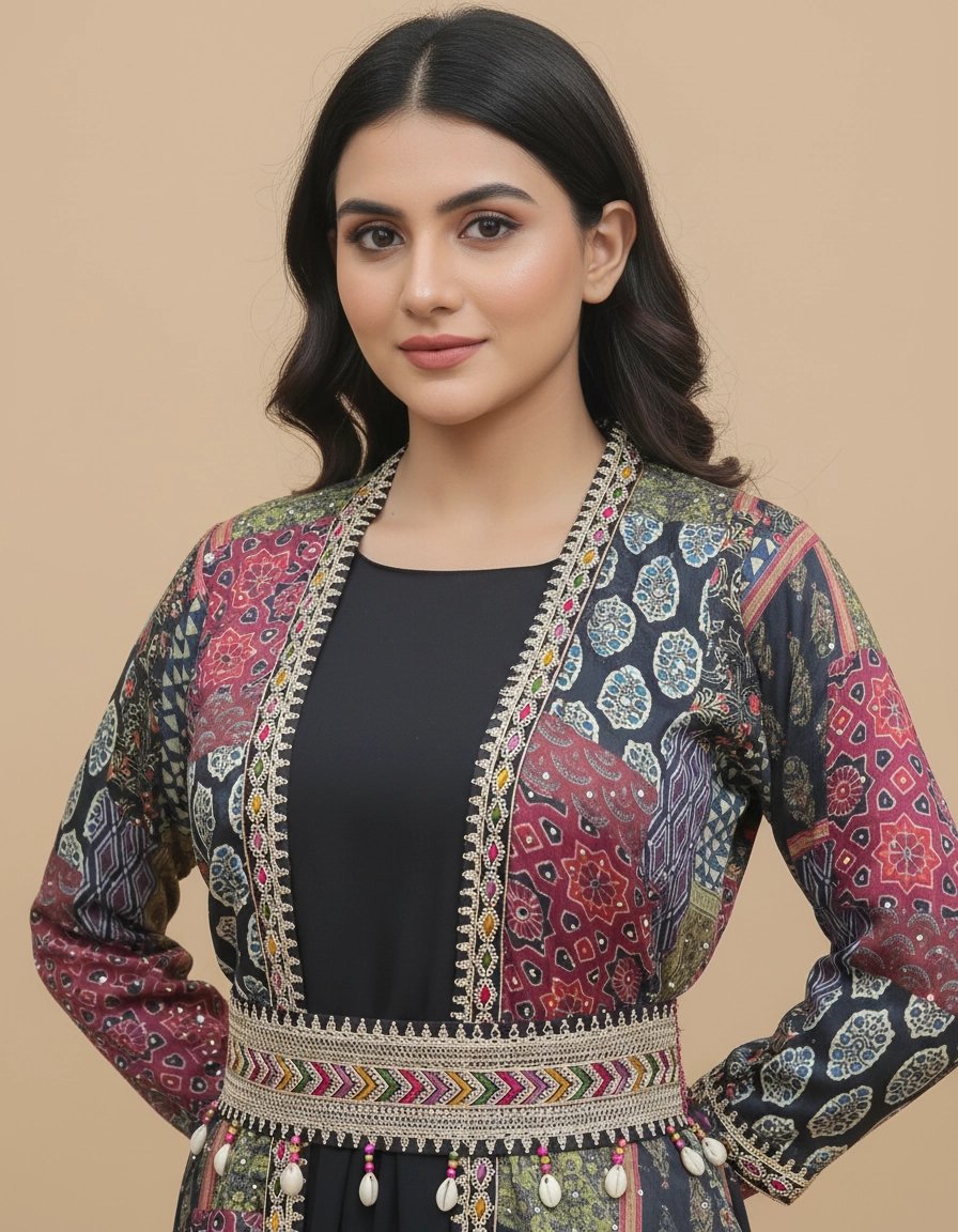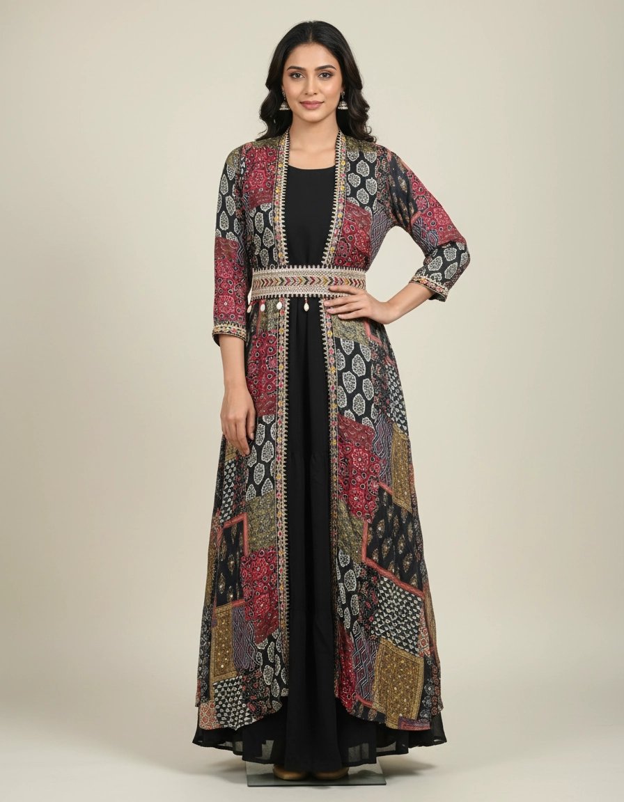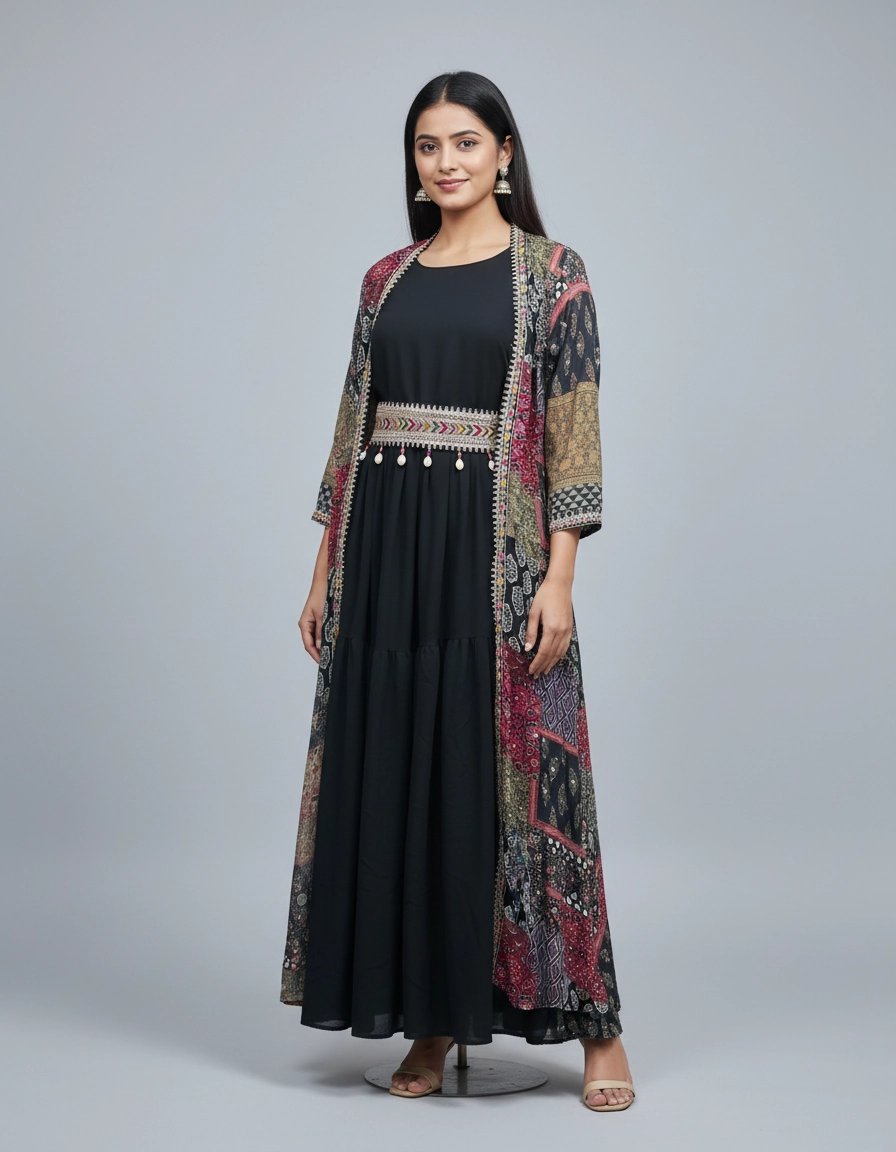 Elevate your ethnic-fusion style with this elegant black inner dress paired with a printed long shrug jacket. The shrug features a beautiful patchwork-inspired print with ethnic detailing and a stylish waist belt that enhances the silhouette. The inner dress is designed in a solid black shade for a classy and balanced look.