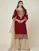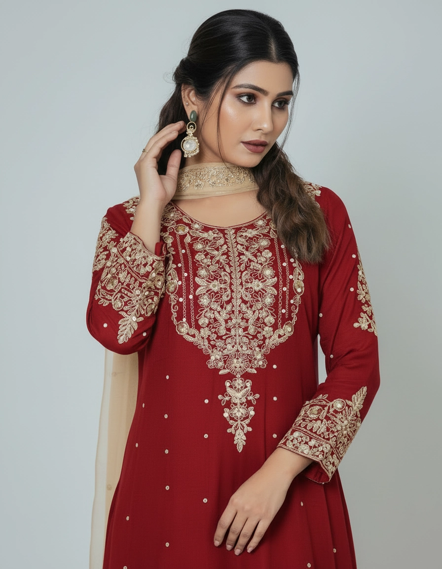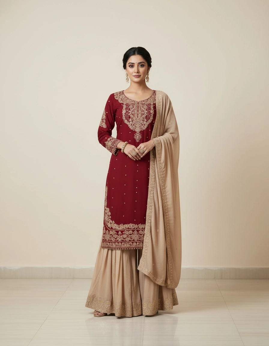 Add timeless elegance to your festive wardrobe with this beautifully crafted maroon kurta palazzo set. Made from premium georgette fabric and enhanced with intricate embroidery, this outfit is perfect for weddings, festive occasions, and special celebrations. The rich color palette and graceful silhouette offer a luxurious ethnic appeal.